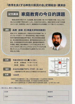 | 日時 平成29年5月13日(土)14:00 場所 かながわ労働プラザ 多目的ホールA [第1部 定期総会] 14:00〜14:50 1.開会 2.国歌斉唱 3.代表挨拶 4.来賓祝辞 5.議長選出 6.議事 第1号議案 平成28年度 活動報告・決算報告 第2号議案 平成29年度 活動計画・予算(案) 7.閉会 [第2部記念講演] 15:00〜16:30 「家庭教育の今日的課題」 高橋 史朗 氏(明星大学特別教授) (プロフィール) 昭和25年、兵庫県生まれ。早稲田大学大学院修了後、スタン フォード大学フーバー研究所研究員。明星大学教授、政府の臨時 教育審議会専門委員、男女共同参画会議議員、埼玉県教育委員会 委員長、親学推進協会会長などを歴任。日本家庭教育学会常任理 事、国家基本問題研究所理事。著書に「教科書検定」「これで子供 は本当に育つのか」「日本が二度と立ち上がれないようにアメリカ が占領期に行ったこと」「『日本を解体する』戦争プロパガンダの 現在」など多数。 ![]() 記録写真 ・会場正面 ![]() ・国歌斉唱 ![]() ・代表挨拶 ![]() ・来賓祝辞 神奈川県議会議員議員 守屋輝彦氏 ![]() 神奈川県議会議員 田中徳一郎氏 ![]() 横浜市会議員 斎藤達也氏 ![]() 教育者ネットワーク埼玉代表 五十嵐勝美氏 ![]() ・議事 議長 山本孝司 日本会議神奈川運営委員長 ![]() ・講演 講師 高橋史朗氏 ![]() ![]() |
